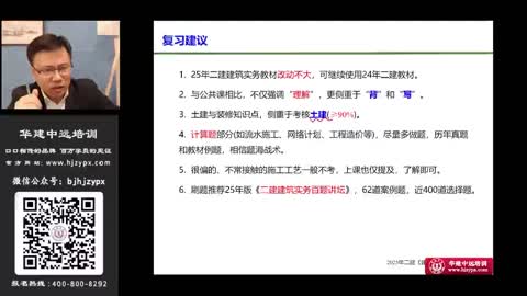 助力班套餐介绍:课程包含2025年精讲阶段、2026年精讲阶段; 课程介绍:2025年精讲2天/科及2025年精讲讲义、2026年精讲2天/科及2026年精讲讲义; 班型优势:属于特价班型,适合学习时间较充裕考生;聘请建造师授课声誉较高的教师进行授课,先通过精讲阶段为考生讲懂、讲会、讲通教材内容,把基础打牢,再通过章节练习题巩固强化知识点,加强实战演练,为通关做好充足准备; 报班即送:全能题库(包含历年真题、仿真模拟题、章节练习题)无需再多花冤枉钱购买教辅材料; 听课方式:多种听课方式满足各种学习需求,APP听课、微信听课、浏览器听课,随时随地学习,手机、电脑、iPad 均可学习,无时间、空间限制; 培训费用:展示价即为当期优惠价,为您省去麻烦的砍价环节,华建中远培训收费采用由低到高阶梯性收费方式,早报名,多优惠,早学习,早通过; 课程有效期:网络课程45-90分钟/节,当年度考试结束课程关闭;